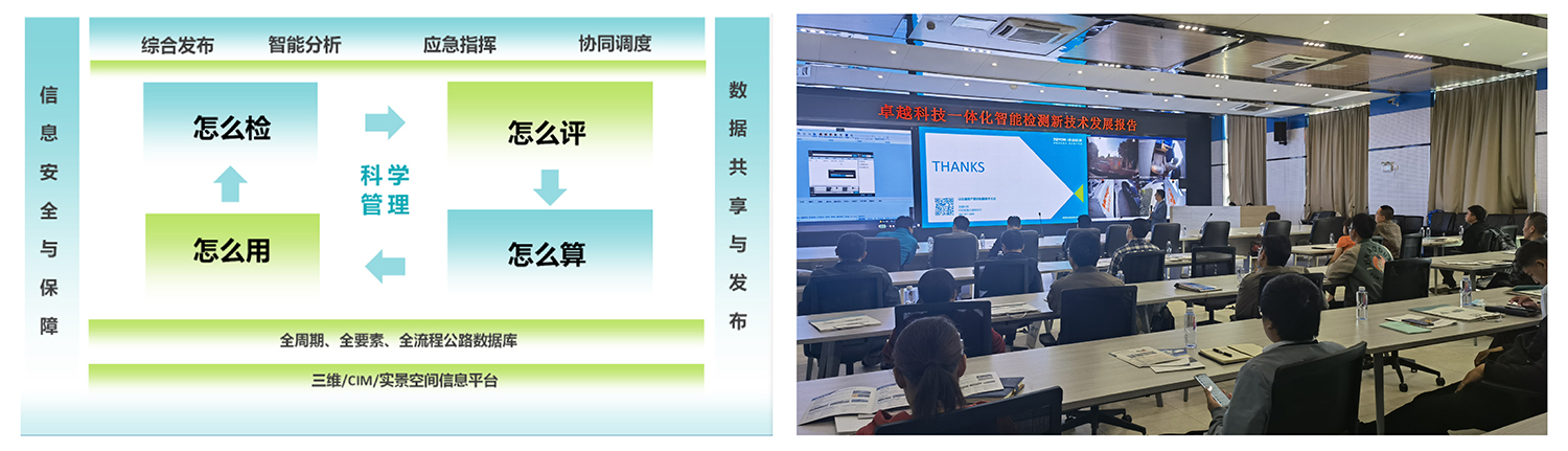 卓越科技董事長(zhǎng)曹民在會(huì)上詳細(xì)介紹了以三維、CIM、實(shí)景空間信息為平臺(tái)的智能檢測(cè)新技術(shù),及全周期、全要素、全流程的公路數(shù)據(jù)庫(kù)的一體化服務(wù),為客戶一站式解決怎么檢、怎么評(píng)、怎么算、怎么用;卓越科技一體化智能檢測(cè)新技術(shù)為客戶實(shí)現(xiàn)“檢”、“評(píng)”、“管”、“養(yǎng)”的信息化、智能化、科學(xué)化。