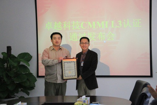 ? 2011年9月21日上午10點(diǎn),在卓越科技二樓會(huì)議室舉行的CMMI?3級(jí)認(rèn)證通過發(fā)布會(huì)上,由美國(guó)SEI授權(quán)的主任評(píng)估師劉海笑鄭重宣布:經(jīng)過嚴(yán)格的現(xiàn)場(chǎng)審核和評(píng)估,卓越科技已經(jīng)達(dá)成了CMMI3級(jí)的目標(biāo),成功通過CMMI3級(jí)認(rèn)證!