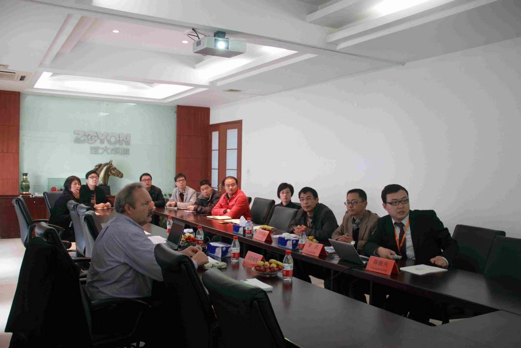圖為卓越科技董事長曹民先生等向邁克教授介紹公司情況